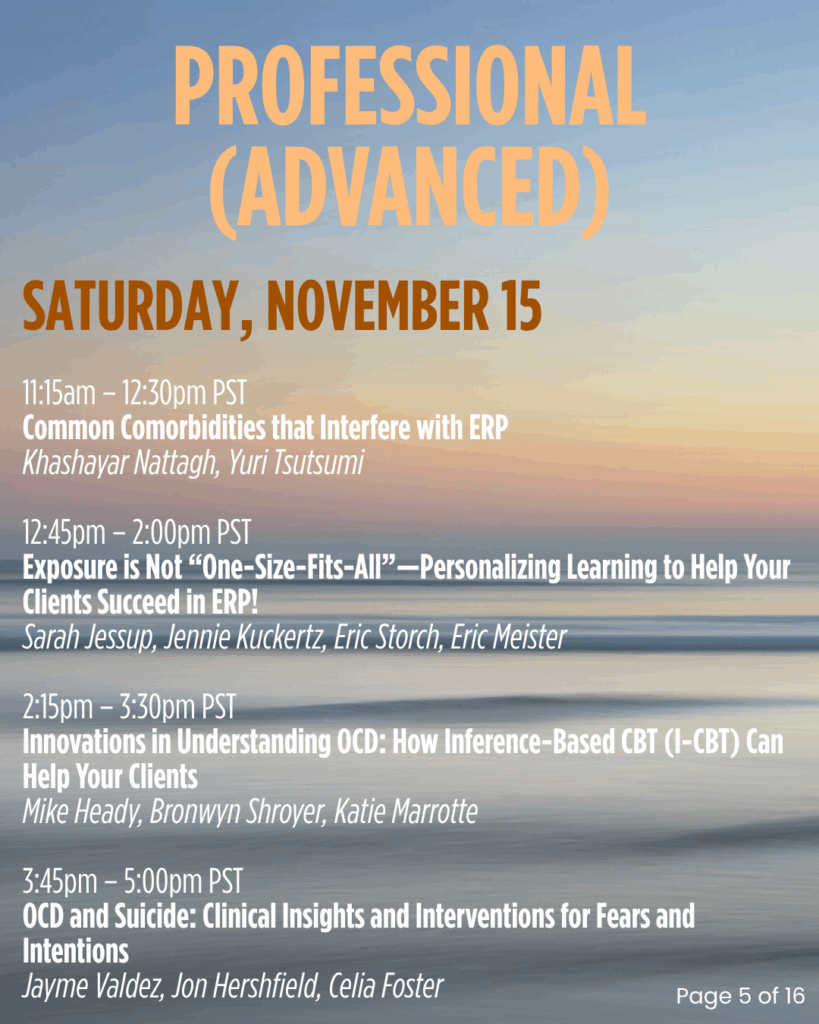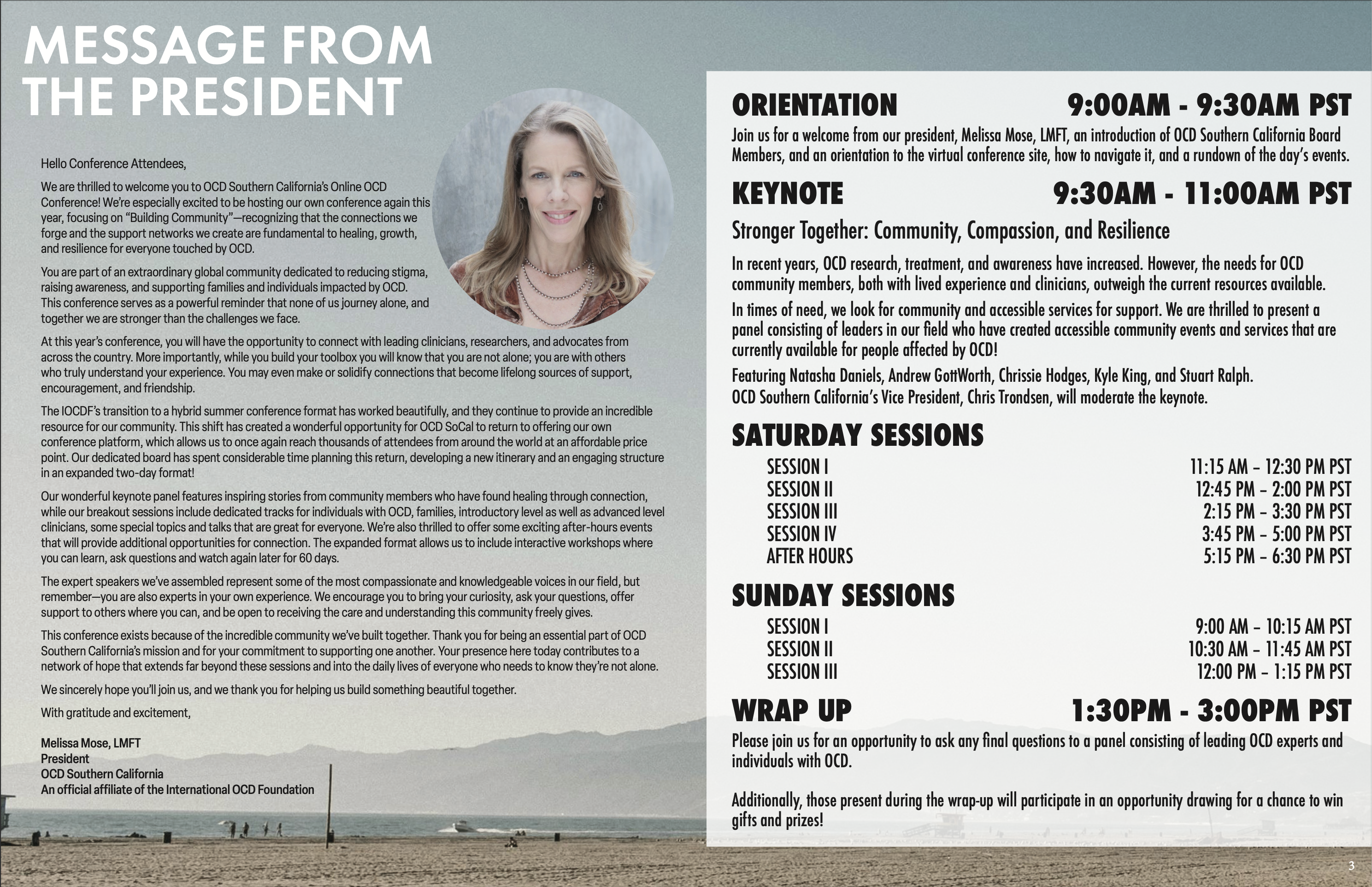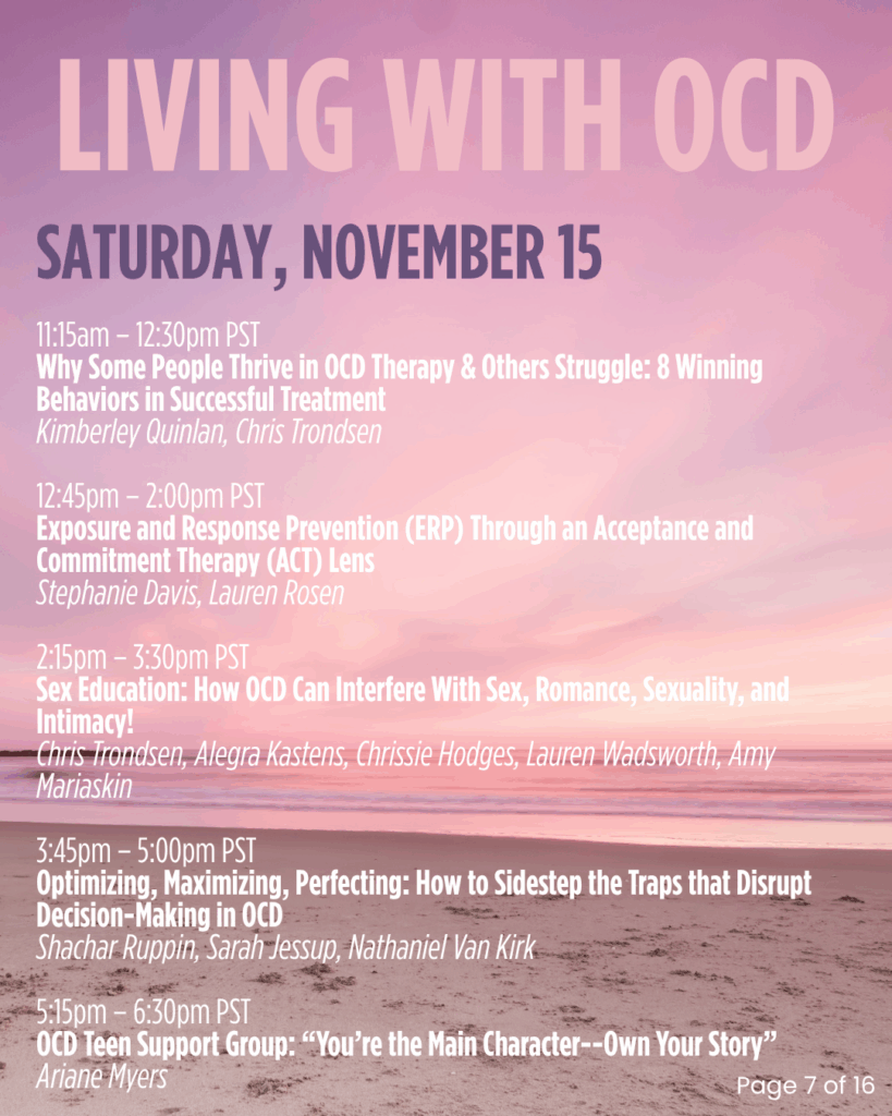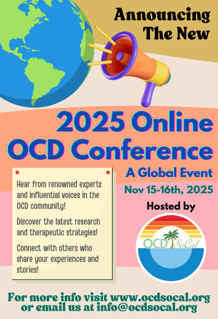 We look forward to seeing you at our Online OCD Conference, a Global Event, on November 15 and 16, 2025! Make sure to register today! Email us with any questions: info@ocdsocal.org! Register today! https://ocdconference.eventbrite.com
