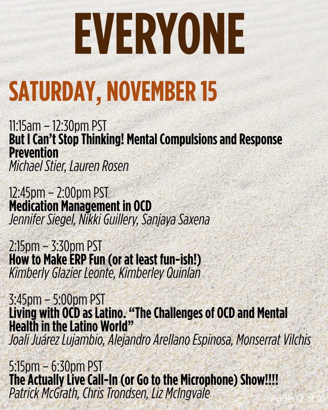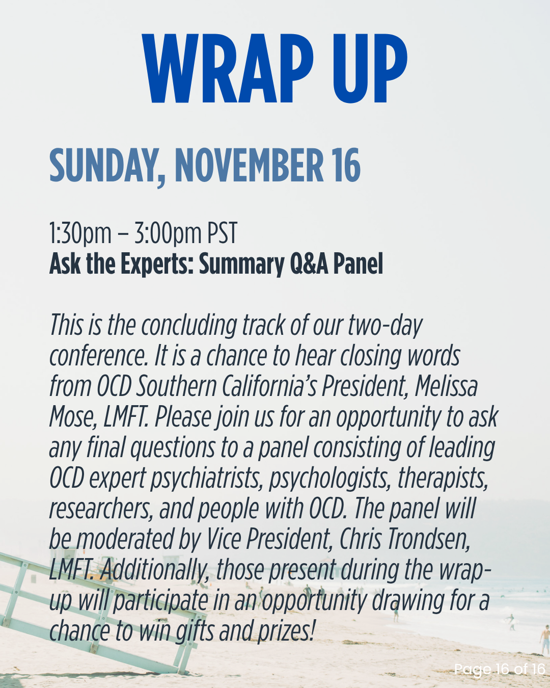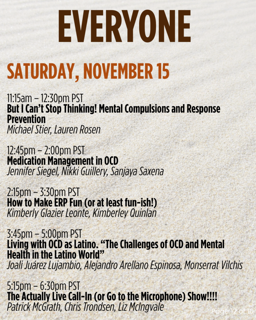 More information on the event will continue to come (view our home page for updated posts on the conference), but we hope you mark your calendars for the weekend of November 15th and 16th and join OCD SoCal’s global, Online OCD Conference this year! See you there! Email us with any questions or to get on our mailing list: info@ocdsocal.org!