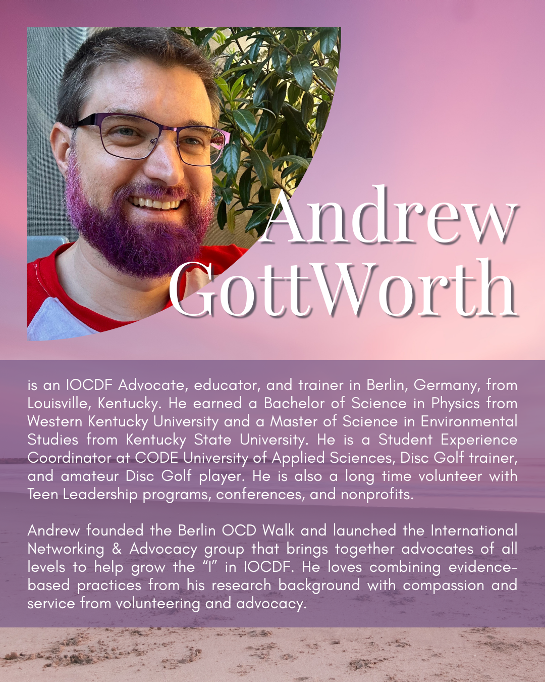 The title of our keynote is “Stronger Together: Community, Compassion, and Resilience” featuring 5 keynote presenters, Chrissie Hodges, Kyle King, Andrew Gottworth, Stuart Ralph, and Natasha Daniels, LCSW. In recent years, OCD research, treatment, and awareness have increased. However, the needs for OCD community members, both with lived experience and clinicians, outweigh the current resources available. In times of need, we look for community and accessible services for support. We are thrilled to present a panel consisting of leaders in our field who have created accessible community events and services that are currently available for people affected by OCD!