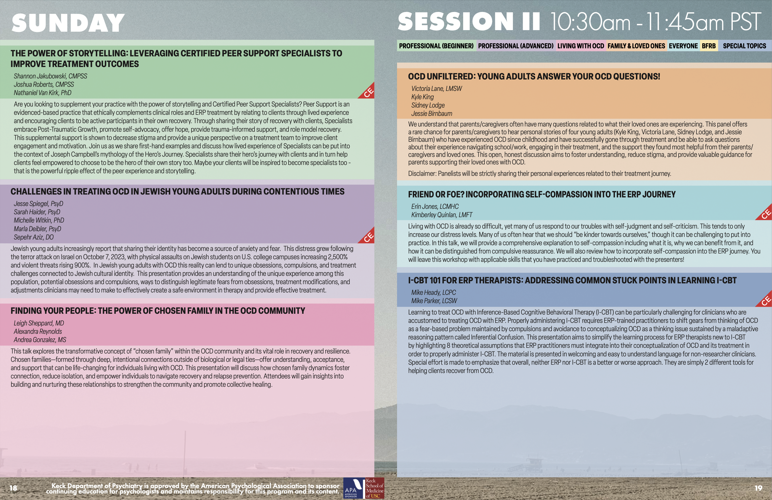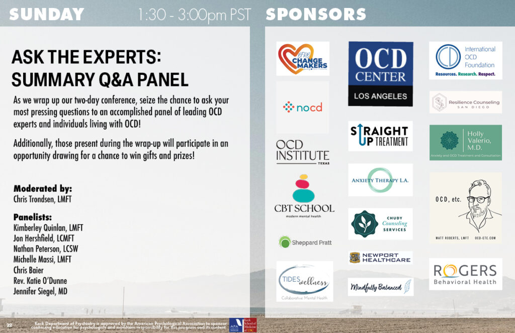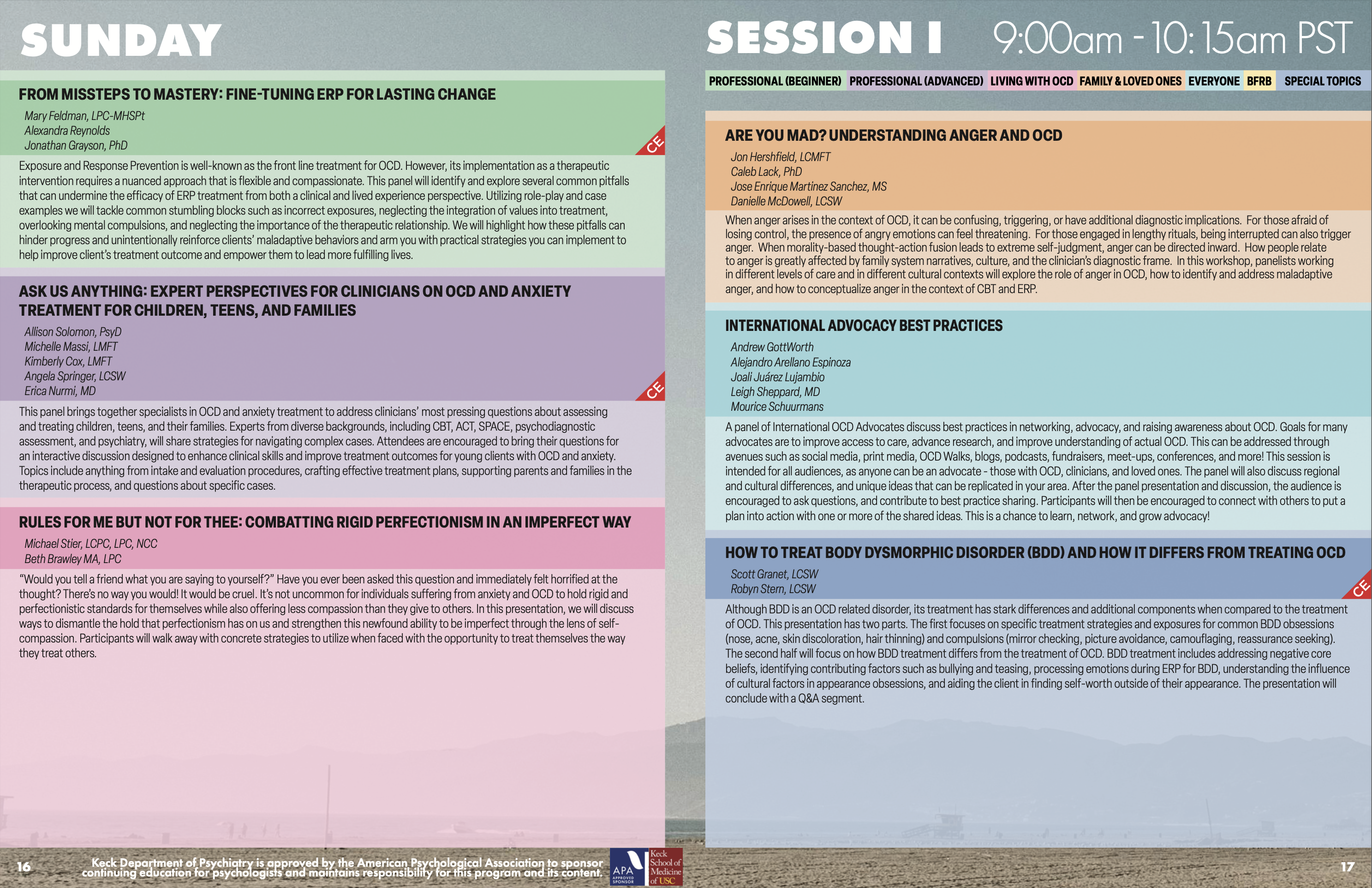 The conference is for people with OCD and their family members, spouses, parents, and loved ones who support them. This conference is also for professionals and educators who want to learn more about the OCD and related disorders community and how to support those impacted. For professionals seeking continuing education credits, we are able to offer 8.75 CEs through the University of Southern California (USC) at a low cost (psychologists, LMFT, LPCC, LCSW)! The general public and clinicians can both register for our conference here: https://ocdconference.eventbrite.com!