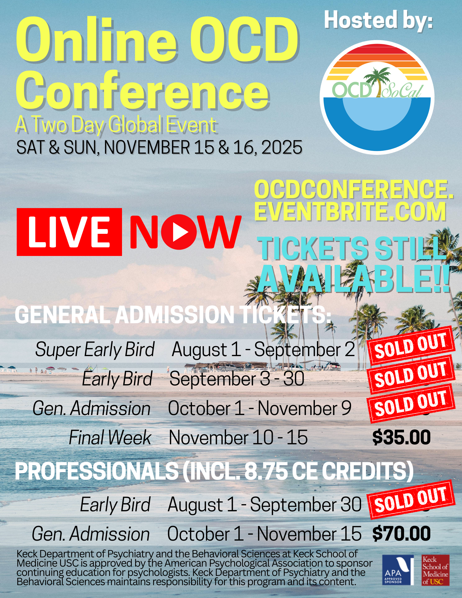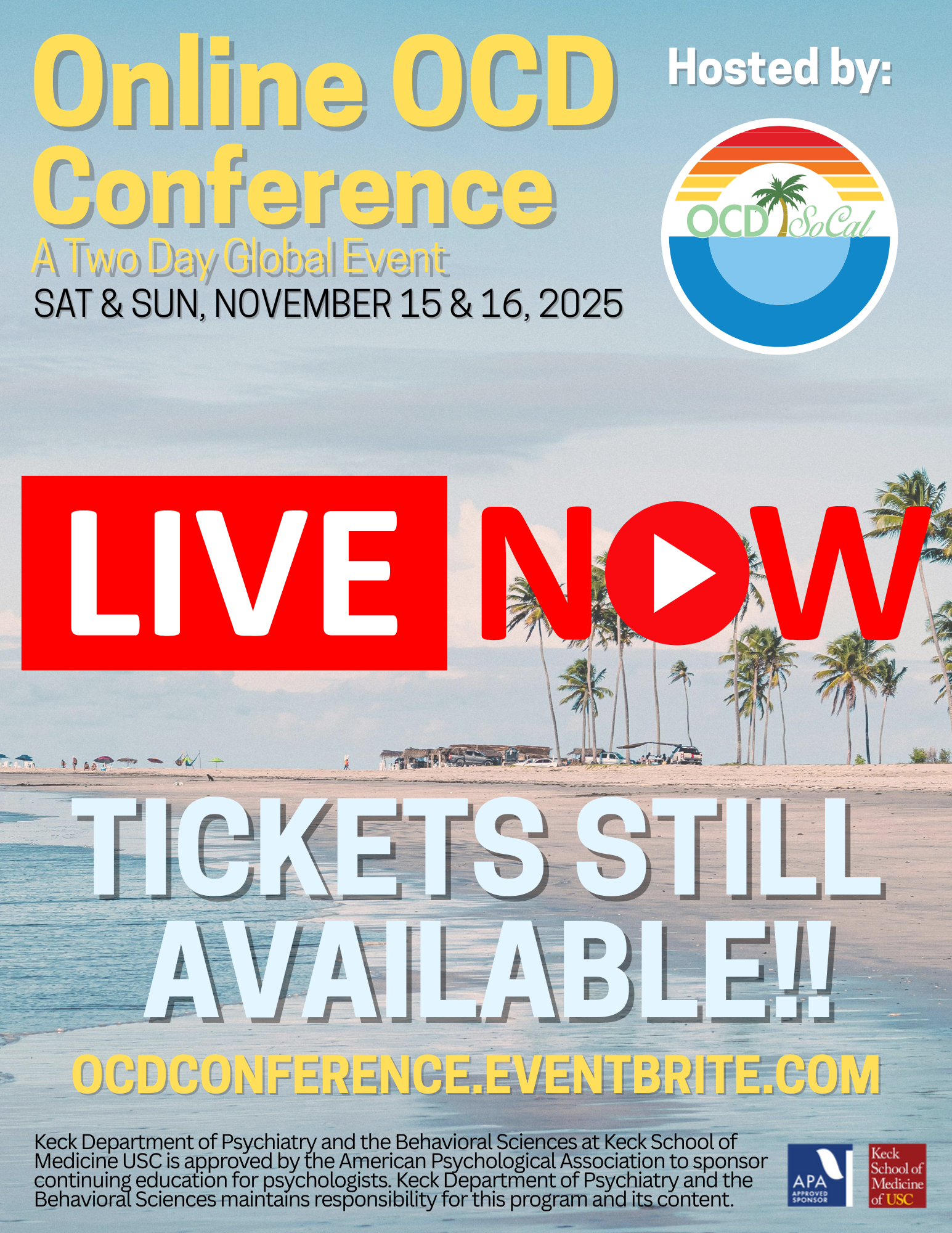 Go to: https://ocdconference.eventbrite.com to register, go to www.ocdsocal.org/conference for more information on our event, email us at info@ocdsocal.org with any questions, and email scholarships@ocdsocal.org for free registration if needed!