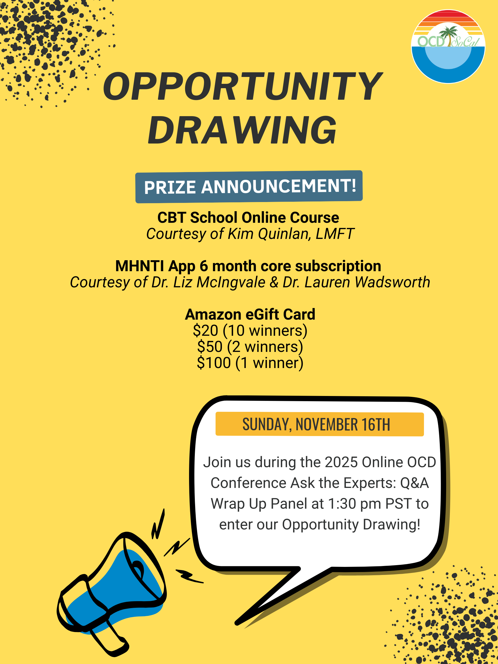 As a thank you to all who joined us, we are ending the wrap-up panel with an opportunity drawing and offering these prizes! If you are present in the Q&A panel, and fill out our anonymous Conference Evaluation, you are entered into the drawing and can win these gifts. OCD SoCal is offering the eGift Cards and a special thank you to CBT School – https://www.cbtschool.com and https://www.mhnti.com (led by Liz McIngvale, Ph.D., LCSW and Lauren Wadsworth, Ph.D., ABPP), for your gift donation!