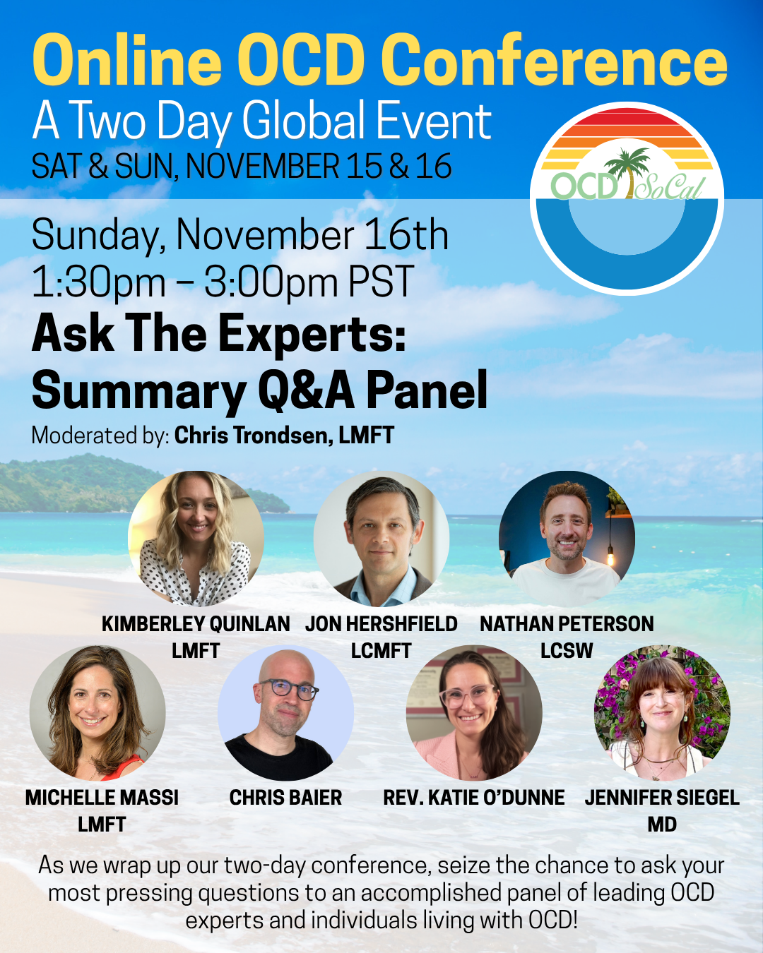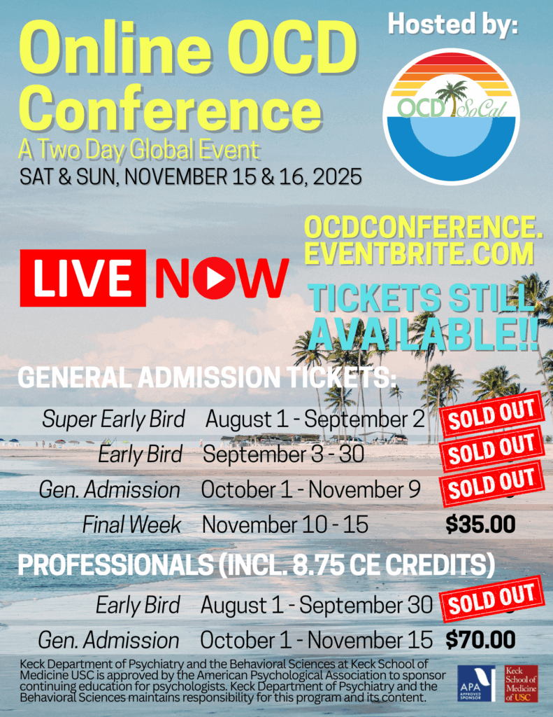 Thank you for the support and we hope you enjoy all of the November 15 – 16 Online OCD Conference, A Global Event, hosted by OCD Southern California!