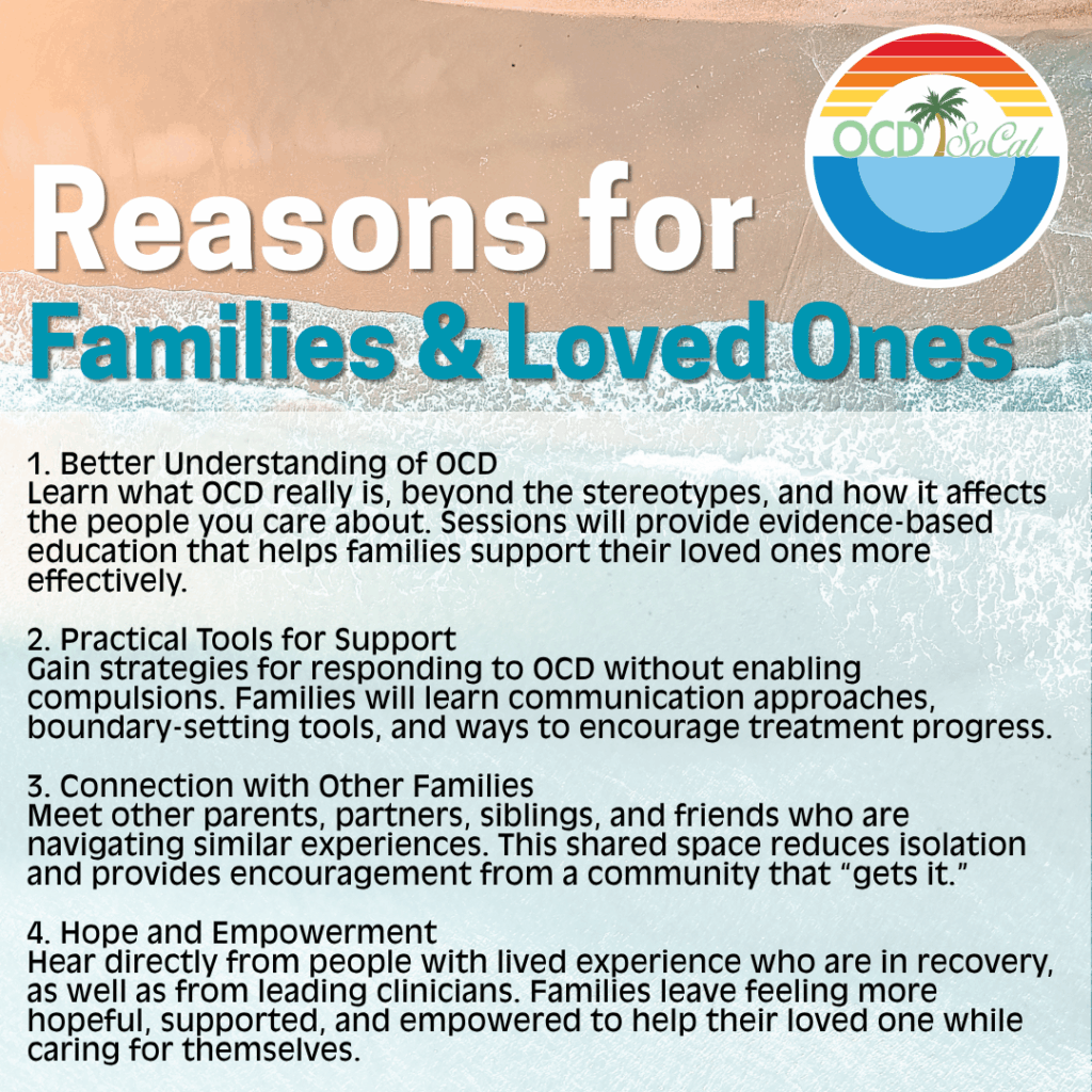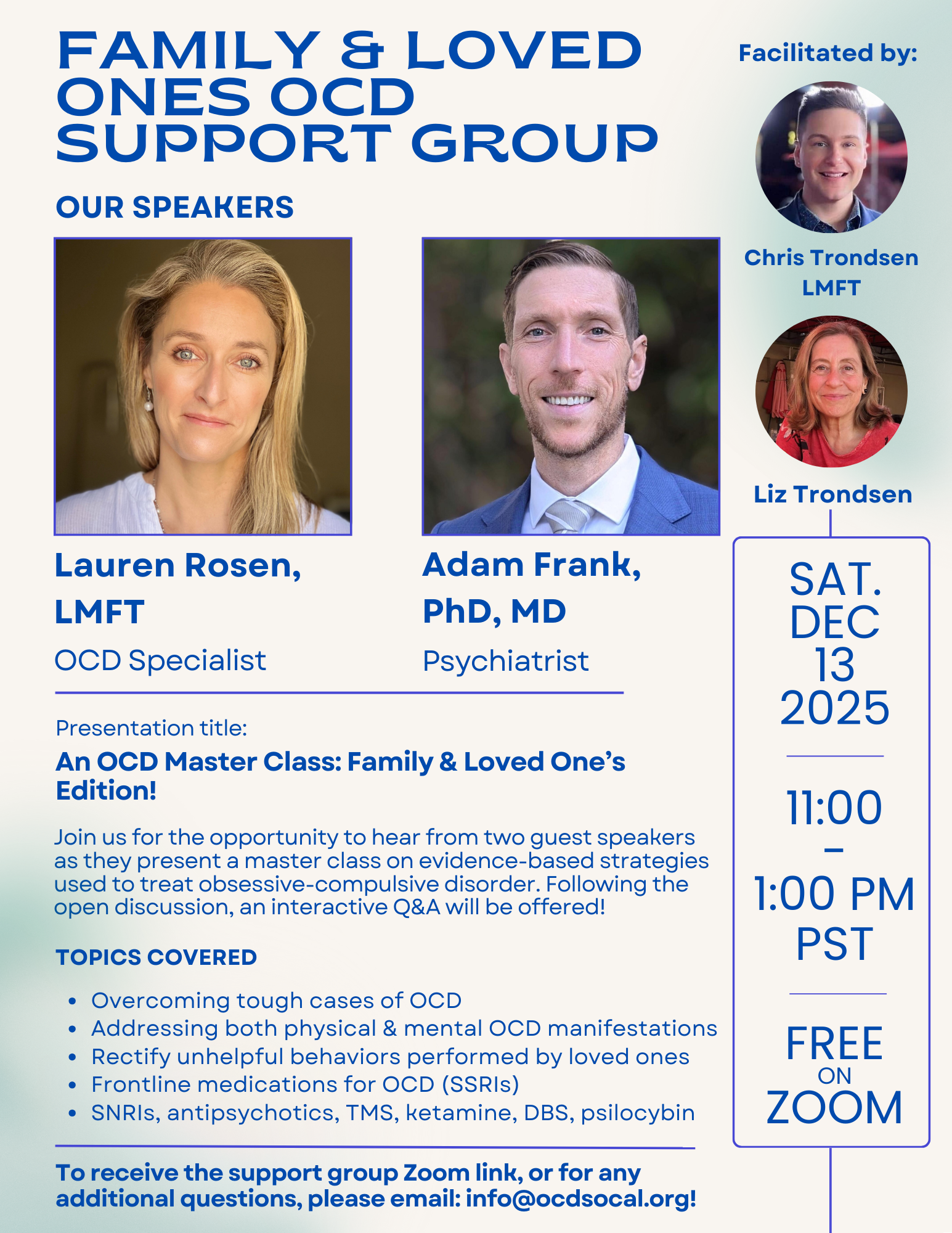 Every second Saturday of the month, from 11am to 1pm PST, OCD SoCal board members Chris Trondsen, LMFT, and Liz Trondsen host a virtual, free, Family & Loved Ones OCD Support Group. To join us for our December support group, which is Saturday, December 13, 2025, from 11am to 1pm PST, please email us at info@ocdsocal.org and just request the link! Anyone from anywhere can join!