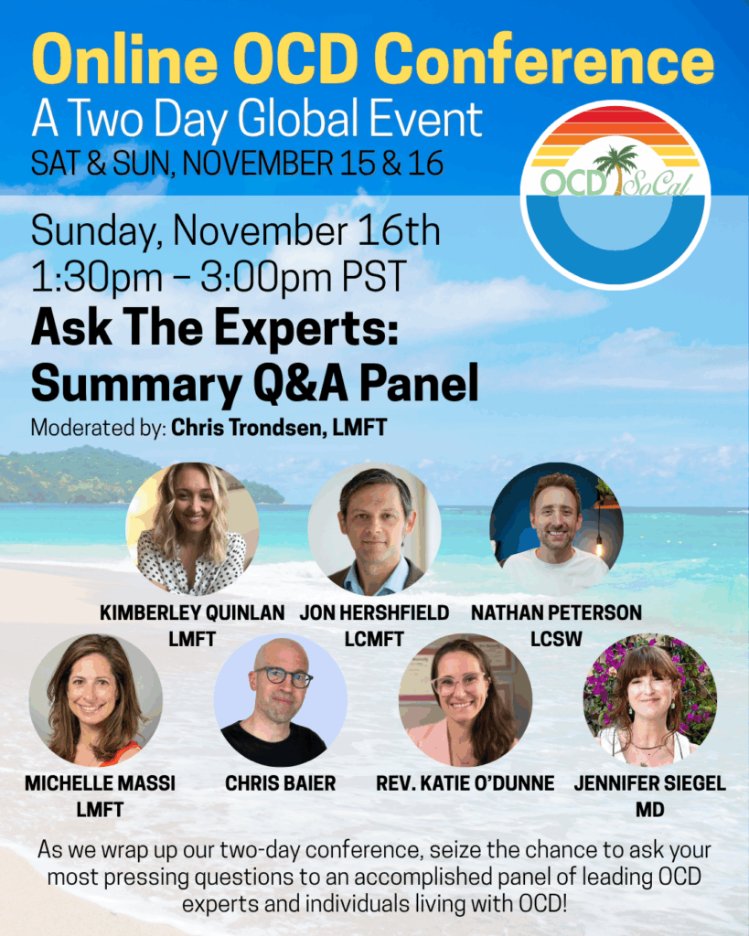 However, you do not want to miss the opening discussion that precedes the Q&A. We have invited Lauren Rosen, LMFT, the author of the upcoming “The Mental Compulsions Workbook for OCD.” Additionally, we will be joined by USC Psychiatrist and researcher, Adam Frank, Ph.D., MD. These two special guests will lend their expertise to lead a complete master class on OCD.