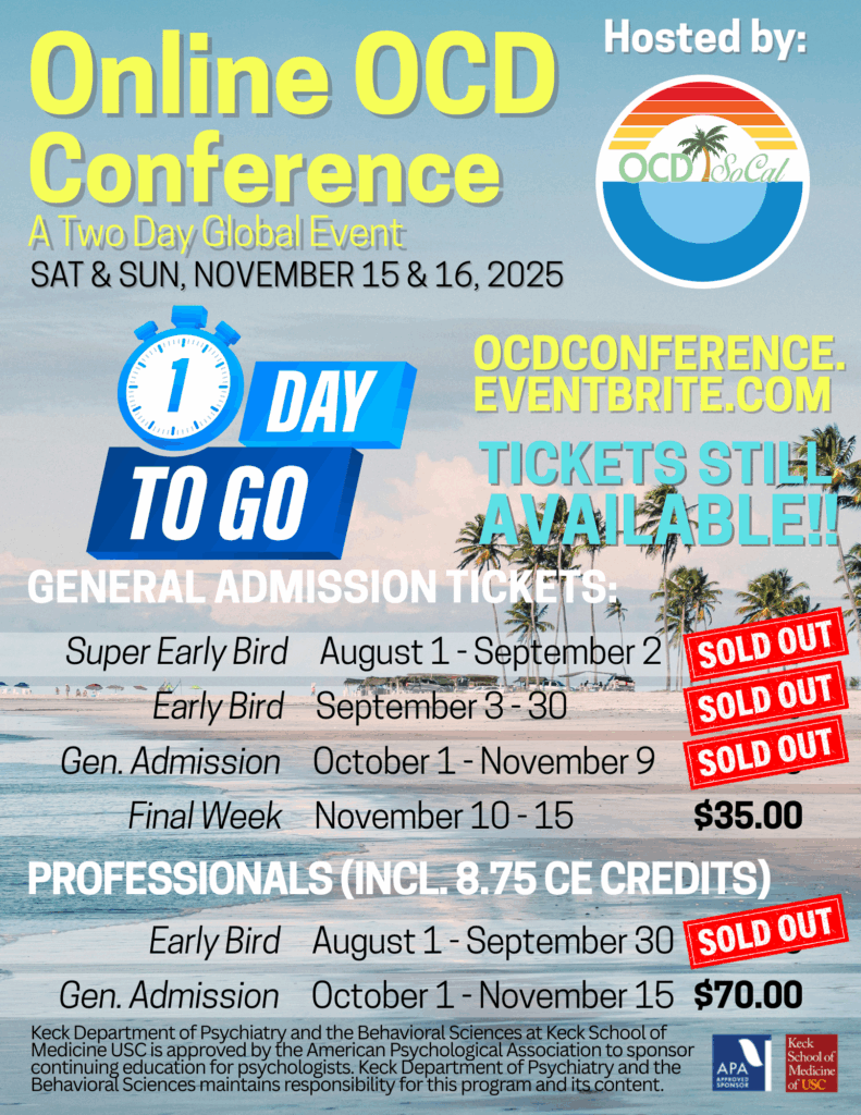 We look forward to seeing you at our Online OCD Conference, a Global Event, on November 15 and 16, 2025! Make sure to register today! Email us with any questions: info@ocdsocal.org! Register today: https://ocdconference.eventbrite.com