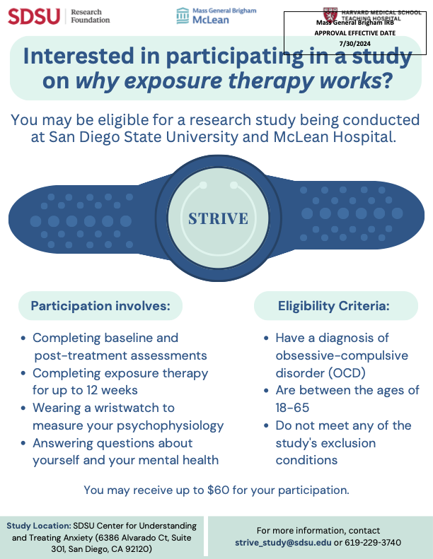 San Diego State University (SDSU) is conducting a research study on why exposure therapy works for people with obsessive compulsive disorder (OCD). Participants will complete up to 12 weeks of exposure therapy, as well as baseline and post-treatment assessments. During each exposure therapy session, participants will wear a wristwatch measuring their psychophysiology. Treatment will be provided at no cost, and participants may receive up to $60 compensation. This study is a multisite clinical trial that is funded by the National Institute of Mental Health and being conducted by researchers at McLean Hospital (PI: Dr. Jennie Kuckertz) and SDSU (Site PI: Dr. Nader Amir).Do you have OCD? Are you over 18 years old? Have you disclosed your OCD to others?