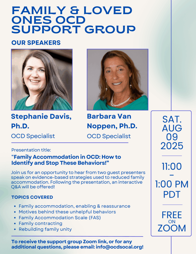 Join us for our August support group on Saturday, August 9, 2025, from 11AM – 1 PM PT.  To receive the support group Zoom link, or for any additional questions, please email: info@ocdsocal.org! Here are our special guests: